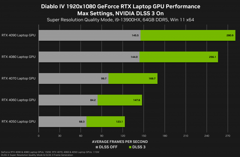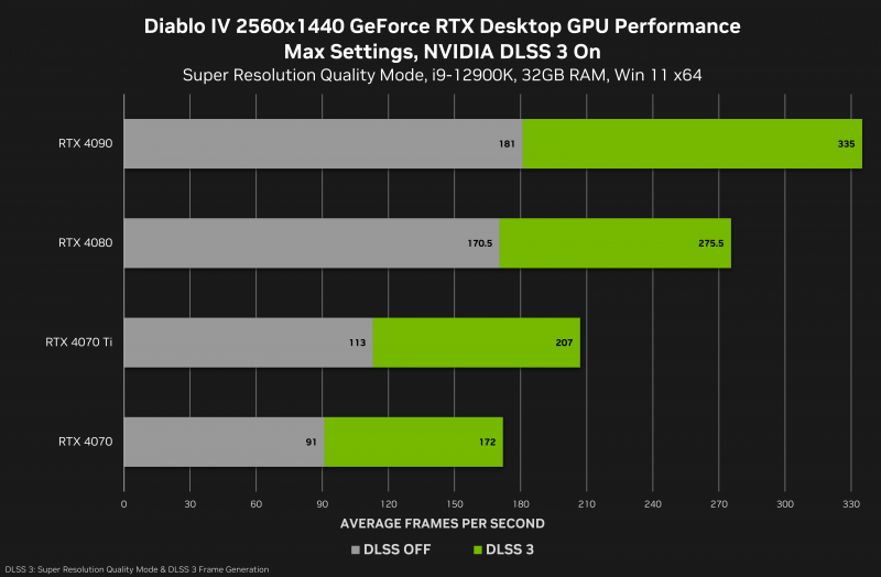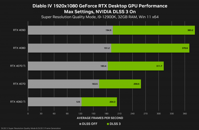 O novo driver também adiciona suporte para CUDA 12.2. A empresa observa que a tecnologia de dimensionamento do DLSS 3 aumenta significativamente a taxa de quadros em Diablo IV em várias resoluções, como pode ser visto nos gráficos abaixo.
