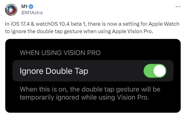 Novas configurações interessantes apareceram nas versões beta dos sistemas operacionais watchOS 10.4 e iOS 17.4. A Apple adicionou uma chave especial que permitirá que os smartwatches Watch Series 9 e Ultra 2 ignorem um dos comandos de gestos para evitar conflitos de controle com o fone de ouvido de realidade aumentada Apple Vision Pro.