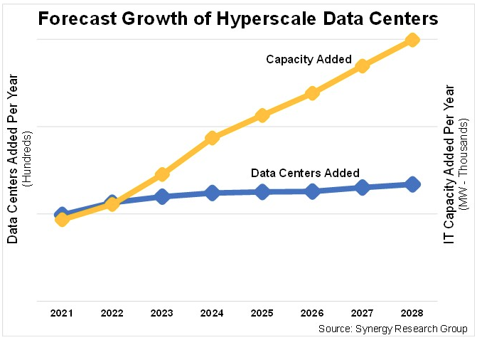 O Synergy Research Group prevê que a capacidade média dos data centers em hiperescala poderá quase triplicar nos próximos 6 anos. De acordo com a assessoria de imprensa da empresa, embora as cargas críticas de hiperscaladores venham crescendo há muito tempo, o desenvolvimento de tecnologias de IA deu um impulso adicional à indústria e em breve exigirá data centers significativamente mais produtivos.