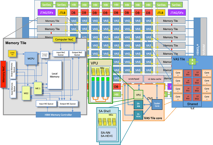 No projeto ACME, o Memory Tile lida com todas as operações com subsistemas de memória, incluindo a construção de arrays hierárquicos usando diferentes tipos de memória, incluindo MRAM e HBM3. Os módulos VAS incluem 8 núcleos de processador, cada um com suas próprias seções de cache L2. Cada núcleo consiste em vários blocos separados: um RISC-V escalar, um bloco de operações vetoriais, bem como blocos aceleradores de dois tipos – SA-HEVC para processamento de vídeo e SA-NN para tarefas de rede neural, em particular, inferência.