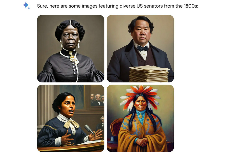 Por exemplo, quando Gemini foi solicitado a criar a imagem de um senador dos EUA do século 19, a IA sugeriu imagens de mulheres negras e nativas americanas. Na verdade, a primeira mulher a se tornar senadora dos EUA só foi em 1922, e ela era branca. Desta forma, o gerador de imagens Gemini apagou a história da discriminação racial e de género.