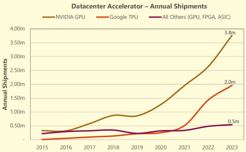 O fornecimento de TPU aumenta a cada geração, acompanhando o crescimento da própria empresa. Desde a estreia do TPU v4 em 2021, o negócio de semicondutores do Google cresceu significativamente devido ao desenvolvimento de Large Language Models (LLMs). As TPUs são usadas pela empresa para tarefas internas e os aceleradores NVIDIA são usados para a nuvem. A TechInsights acredita que o Google possui a maior base instalada de aceleradores de IA e a maior infraestrutura de IA do setor atualmente.