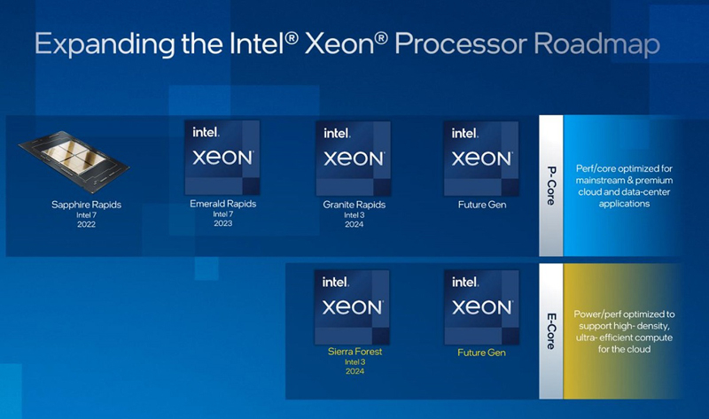 O lançamento dos processadores Xeon Emerald Rapids está previsto para 2023 e o Xeon Granite Rapids para 2024. Ao mesmo tempo, aparecerá o Xeon Sierra Forest – o primeiro chip de servidor Intel com E-cores energeticamente eficientes. Espera-se que o Emerald Rapids seja construído com a tecnologia de 7 processos da Intel, que é uma versão melhorada da tecnologia de 10 nm. Por sua vez, os Granite Rapids estão planejados para serem fabricados com a Tecnologia Intel 3, que inclui melhorias em termos de consumo de energia e desempenho.