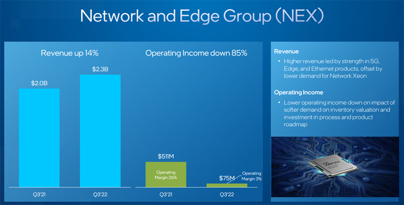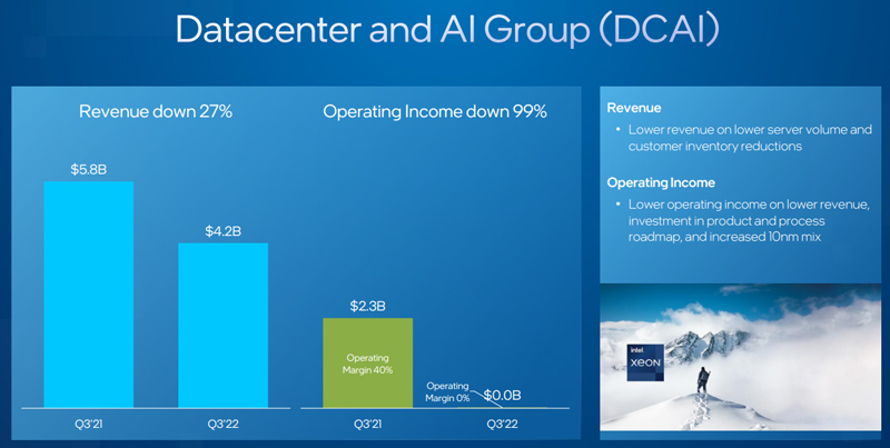 No geral, a Intel reconhece que as vendas do grupo DCAI podem ser prejudicadas à medida que a demanda por chips de servidor diminui devido à desaceleração econômica e à demanda em declínio nos mercados corporativo e de nuvem. Grandes atualizações de data centers, incluindo sites da AWS e do Microsoft Azure, atingiram o limite inferior de um ciclo típico de dois anos.