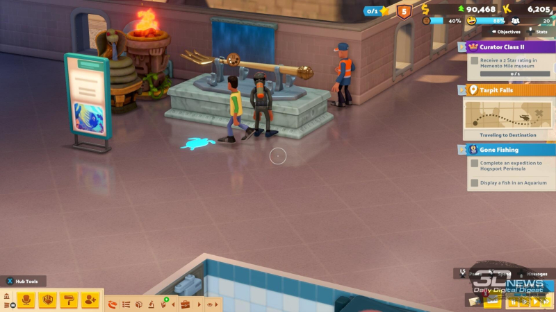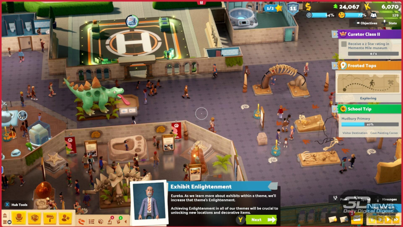 E é bom que o Two Point Museum geralmente faça um bom trabalho ao explicar a maioria das mecânicas de jogo. O jogador geralmente é guiado pela mão para que ele execute certas ações em ordem, as quais ele posteriormente terá que repetir mais de uma vez. Mas nem tudo é explicado, e algumas coisas permanecem um mistério até que uma tarefa relacionada apareça. Por exemplo, em algum momento você pode ser solicitado a atingir uma pontuação média de satisfação dos funcionários acima de 75%. Jogadores familiarizados com a série sabem o que fazer, mas os novatos nem foram informados de que os funcionários podem receber um aumento, e há um menu separado com emoticons mostrando o quão feliz cada funcionário está com sua renda. Além disso, os controles do console continuam um pouco desajeitados: o que requer um clique (ou nenhum) no PC é feito com dois botões diferentes no Xbox. Mas essas são as peculiaridades do gênero – os desenvolvedores provavelmente fizeram todo o possível para tornar o jogo em um gamepad o mais confortável possível.