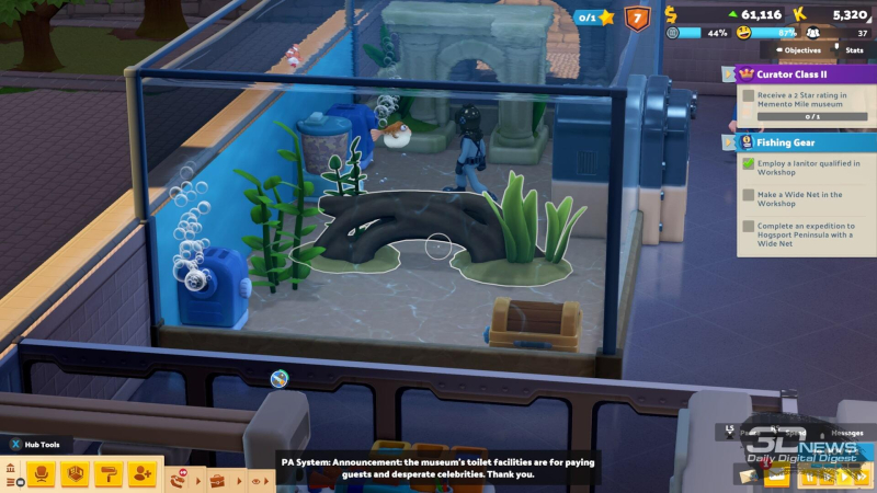 A série Two Point sempre foi muito emocionante – esses são os jogos que você joga de manhã por algumas horas e, depois dessas “duas horas”, de repente já é noite profunda. No Museu, a fórmula foi levada quase à perfeição, para que o perfeccionista interior tente simultaneamente agradar a si mesmo com certas decisões e deixar os visitantes do museu felizes. Por exemplo, quando você encontra uma parte de um esqueleto de dinossauro, é difícil dizer por que você envia imediatamente a próxima expedição ao mesmo lugar – para obter uma exposição de alta qualidade que renderá mais dinheiro, ou porque você mesmo quer terminar o que começou e agradar os olhos com esse objeto. Ou quando você coleta peixes para um museu aquático, você pode encher o aquário com o primeiro peixe que encontrar (por exemplo, cópias de peixe-palhaço – este é literalmente um peixe com nariz de palhaço), mas você quer coletar uma coleção única.