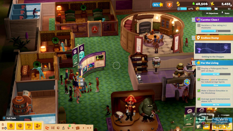 Há um local em um prédio abandonado ao lado de um cemitério, onde você coleta brinquedos assustadores e captura poltergeists, que os visitantes observam através do vidro. Há um museu costeiro com aquários de peixes únicos. Há apenas cinco museus, o que parece um número pequeno comparado às onze universidades do Two Point Campus, mas você não sente falta de conteúdo. A campanha (como sempre, sem enredo) é estruturada de forma diferente: aqui, você precisará retornar regularmente aos locais visitados para melhorá-los, desbloquear novos recursos e ganhar classificações mais altas. Gostei mais dessa abordagem do que mudar de um prédio para outro no Two Point Campus, onde, depois de conseguir a primeira estrela de três, você abandonava aquela “universidade” e ia para a próxima, esquecendo da anterior.