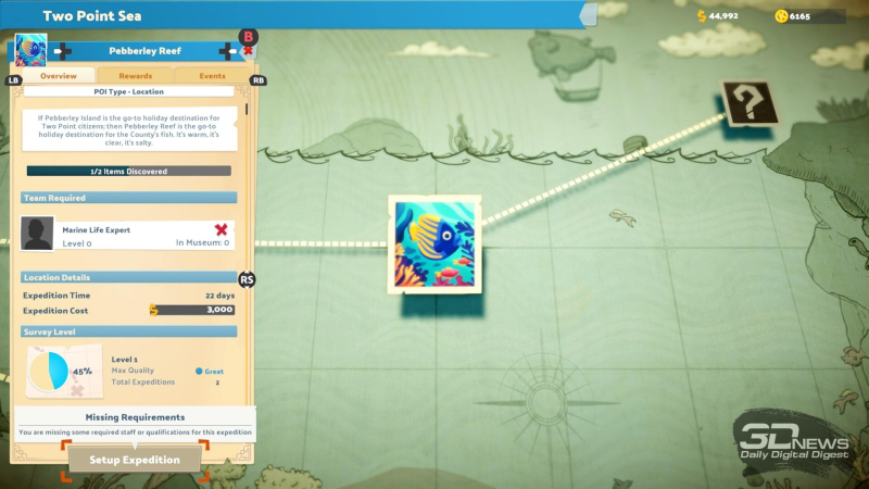 Inicialmente, o jogador recebe algumas exibições de graça, mas um museu assim não renderá muito dinheiro: você precisa procurar por novas exibições em algum lugar. A principal característica do Museu Two Point é explicada rapidamente: logo nos são oferecidas pessoas da equipe que entrarão em um helicóptero e farão uma expedição por alguns dias de jogo. É aqui que você pode encontrar fósseis, esqueletos, plantas exóticas e muitas outras curiosidades, dependendo do tipo de museu que você está desenvolvendo.