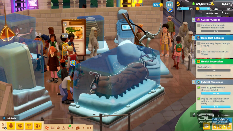 O primeiro museu ao qual você tem acesso é dedicado a achados pré-históricos. Lá, o jogador é apresentado à mecânica básica, incluindo os parâmetros de buzz e conhecimento que cada exposição possui. Digamos que você coloque um fóssil com uma pegada enorme: ele atrairá a atenção de alguém, mas dificilmente deixará uma impressão forte. Adicione um painel informativo ao lado do fóssil e o visitante poderá aprender algo sobre ele. Você coloca decorações do mesmo estilo ao redor, e a exposição começa a brilhar com cores diferentes. Quanto mais decoração, melhor (dentro das limitações, é claro), e algumas exibições ganham pontos extras de prazer se houver um objeto específico próximo a elas.