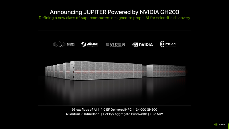 Um dos principais blocos de Júpiter será baseado na plataforma Eviden BullSequana XH3000 com refrigeração líquida direta, e cada nó incluirá módulos Quad GH200. O número total de superchips será de 23.752. NVIDIA Quantum-2 InfiniBand será usado como interconexão. O desempenho das operações de treinamento de IA será de até 93 Eflops, e o desempenho do FP64 deverá chegar a 1 Eflops. Neste caso, o consumo total de energia de Júpiter será de apenas 18,2 MW.