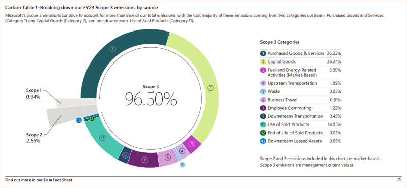O Escopo 3 é responsável por mais de 96% das emissões da Microsoft, incluindo cadeia de suprimentos, ciclo de vida dos dispositivos e outras fontes indiretas. As emissões próprias da empresa (Escopo 1 e 2) diminuíram 6% desde 2020, graças à compra de energia limpa, à participação em vários programas “verdes” e à compra de certificados de energia renovável.