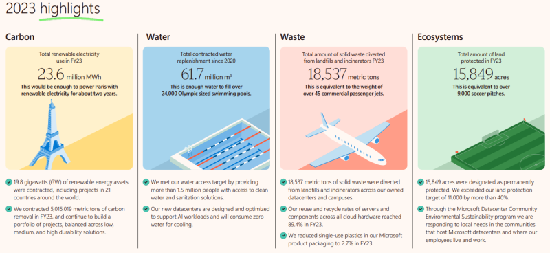 De acordo com o Relatório de Sustentabilidade Ambiental de 2024, que se concentra nas estatísticas do ano fiscal de 2023, que terminou em 30 de junho do último ano civil, as emissões de CO2 aumentaram 29,1% desde 2020. Principalmente devido às emissões indiretas de Escopo 3 associadas à construção e fornecimento de cada vez mais data centers. Durante este período, a Microsoft começou a aumentar o seu apoio à IA após uma explosão de interesse no tema com a estreia do ChatGPT da OpenAI.