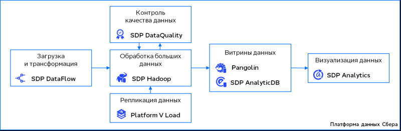 A plataforma SberData para trabalhar com dados combina vários serviços importantes. São eles SDP DataFlow (carregamento e transformação de dados), SDP Hadoop (armazenamento e processamento de big data), SDP Analytics (análise e visualização de informações), SDP DataLab (desenvolvimento de modelos de aprendizado de máquina), etc. Serviços adicionais – SDP Data Quality ( controle de qualidade de dados), Platform V Pangolin (SGBD relacional baseado em PostgreSQL) e SDP AnalyticDB (data warehouse analítico).