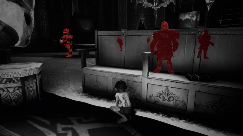 Às vezes Gollum se transforma em uma ação furtiva: você se esconde nas sombras, rasteja sob as mesas e joga pedras para distrair os guardas. No início, o jogo, por algum motivo, explica como derrubar os oponentes silenciosamente, aproximando-se deles por trás, mas no final você quase nunca o usa – porque muitos não podem ser eliminados de forma alguma e porque esse processo dura cerca de dez segundos . Outro guarda notará você durante esse tempo ou é muito mais fácil e rápido passar correndo se houver apenas um inimigo na sala. Mesmo que eles percebam você e você tenha tempo de se esgueirar para algum lugar, ninguém dará o alarme – eles ficarão parados por alguns segundos, o ponto de interrogação acima de suas cabeças desaparecerá e a vida continuará como se nada tivesse acontecido.