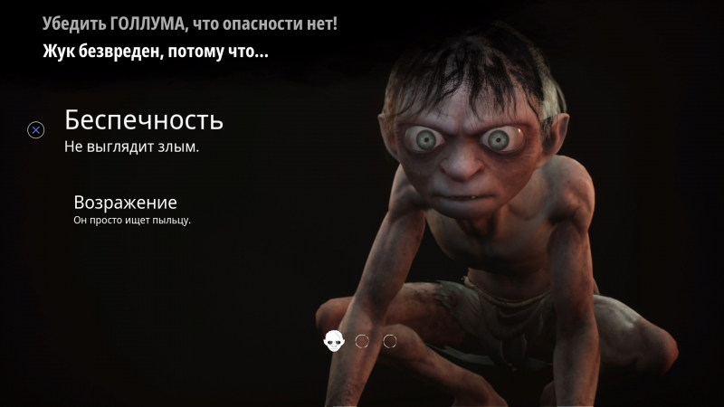 Um dos principais “chips” de Gollum foi chamado de capacidade de escolher ações – de vez em quando o jogador é oferecido para responder como Gollum ou como Smeagol, ou seja, ser agressivo ou educado; mostre malícia ou mostre bondade. Em alguns casos, não basta apenas escolher uma das opções – acontece que depois disso você precisa convencer Gollum / Smeagol da correção da solução, escolhendo as respostas corretas para suas perguntas. Seja como for, é muito difícil entender o que exatamente essas ações afetam e o que mudaria com uma escolha diferente. Suspeita-se que de qualquer forma a trama teria continuado exatamente da mesma forma – ou o guarda não batia em você, ou um companheiro de cela seria punido em vez de outro, e assim por diante. Como as consequências são tão sutis, esses dilemas morais logo desaparecem.