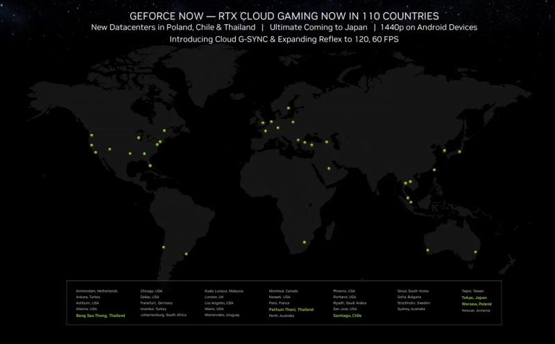 O serviço GeForce NOW estará disponível no Japão nesta primavera. A empresa também anunciou que abrirá novos data centers para GeForce NOW na Polônia, Chile e Tailândia. Com isso, a geografia do serviço se expandirá para 110 países.