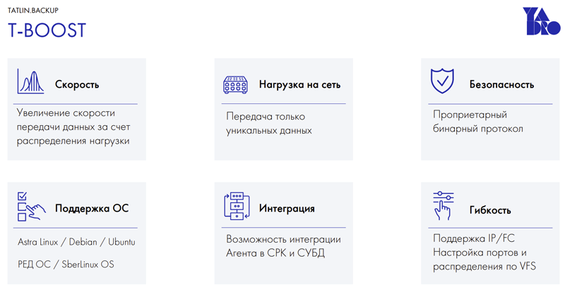 Uma característica especial do TATLIN.BACKUP versão 1.1 é o suporte ao protocolo proprietário T-Boost – um desenvolvimento proprietário dos engenheiros da YADRO, que aumenta a eficiência e produtividade dos processos de backup distribuindo a carga. A tecnologia proporciona desduplicação na origem (cliente) e transmissão apenas de dados exclusivos, o que pode reduzir significativamente a carga na rede e agilizar o processo de gravação de backups. O T-Boost permite o uso de NFS/CIFS/FC e requer um plugin (agente) no lado do cliente.
