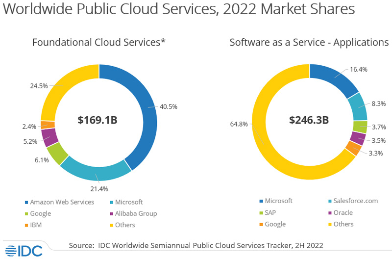 A maior direção do mercado global de nuvem pública são os serviços SaaS, que renderam US$ 246,3 bilhões em 2022 com uma participação de 45,1% nos custos totais. Em segundo lugar estão os serviços IaaS com US$ 115,5 bilhões e 21,2% do setor. Em seguida, vêm as plataformas PaaS – US$ 92,6 bilhões e 17,0%, bem como os sistemas SaaS-SIS – US$ 91,4 bilhões e 16,7% do mercado global.