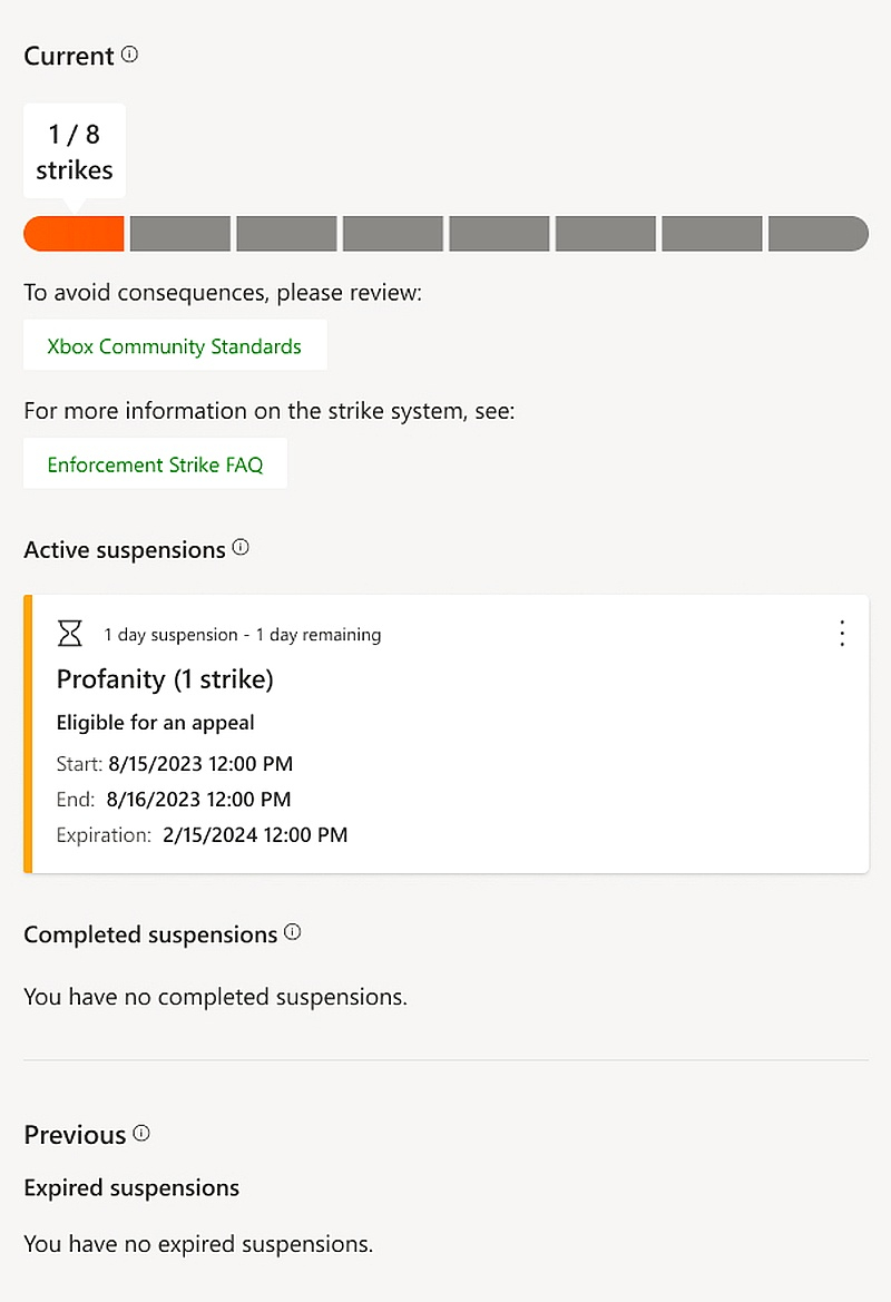 Cada estágio tem sua própria gravidade de punição – para duas violações, o jogador será bloqueado por um dia e quatro violações levarão a um bloqueio semanal. Se forem cometidas oito infrações, o prazo de bloqueio será de um ano. O bloqueio neste contexto está restringindo o acesso a mensagens, multijogador e outros recursos sociais no ecossistema do Xbox. As multas são acumuladas por seis meses e depois “queimadas”. Em sua conta, os jogadores terão acesso a informações completas sobre as multas acumuladas e suas causas.