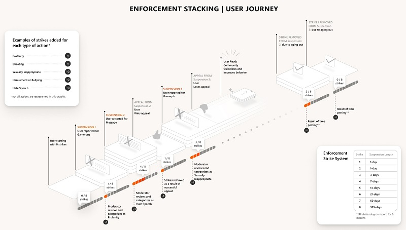 McCarthy relatou que apenas cerca de 1% dos jogadores do Xbox são penalizados e apenas um terço desse 1% comete violações repetidas dos padrões da comunidade do Xbox. O Xbox não planeja publicar uma lista completa de violações e seu número correspondente de avisos, mas forneceu um infográfico do número de avisos versus escalonamento de comportamento (anexado acima).
