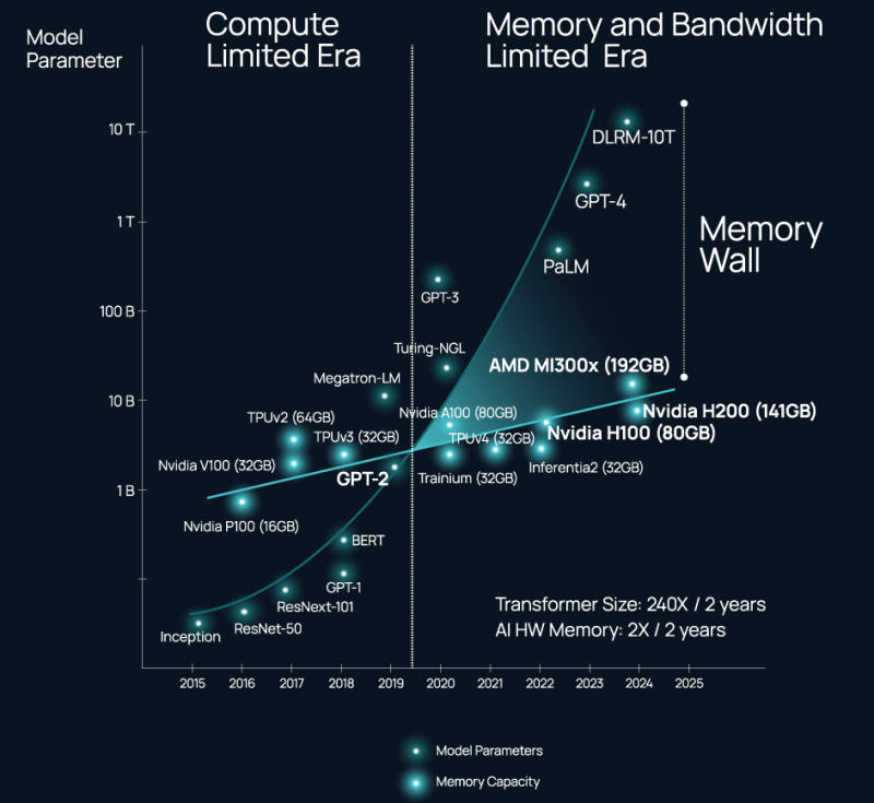 O problema não é a disponibilidade e seleção de uma interconexão adequada, mas a perda acentuada de largura de banda fora da embalagem do chip (a chamada Parede de Memória). Sim, a memória HBM é rápida, mas está fortemente ligada aos recursos de computação e, como resultado, como observou o chefe da Celestial AI em um comentário ao The Next Platform, a indústria de IA usa aceleradores NVIDIA como os controladores de memória mais caros no mundo.