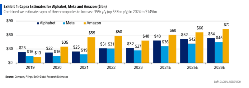Quanto ao hardware, o BofA prevê um rápido aumento nas despesas de capital na Amazon, Alphabet/Google e Meta/Facebook – em 2024 crescerão 43% em termos anuais, para 145 mil milhões de dólares. :