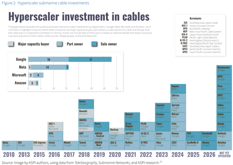 Nos últimos dez anos, a capacidade dos links de comunicações submarinas internacionais controladas por hiperscaladores como Google, Meta✴, Microsoft e Amazon cresceu de 10% para 71%. O Register relata, citando dados do Australian Strategic Policy Institute (ASPI), que isto mudou completamente a indústria e até colocou em risco infra-estruturas críticas. A ASPI enfatiza que o impacto dos hiperscaladores ainda não está sendo levado a sério. Enquanto isso, as maiores empresas de TI estão deixando de ser usuárias de cabo para se tornarem proprietárias de cabos.