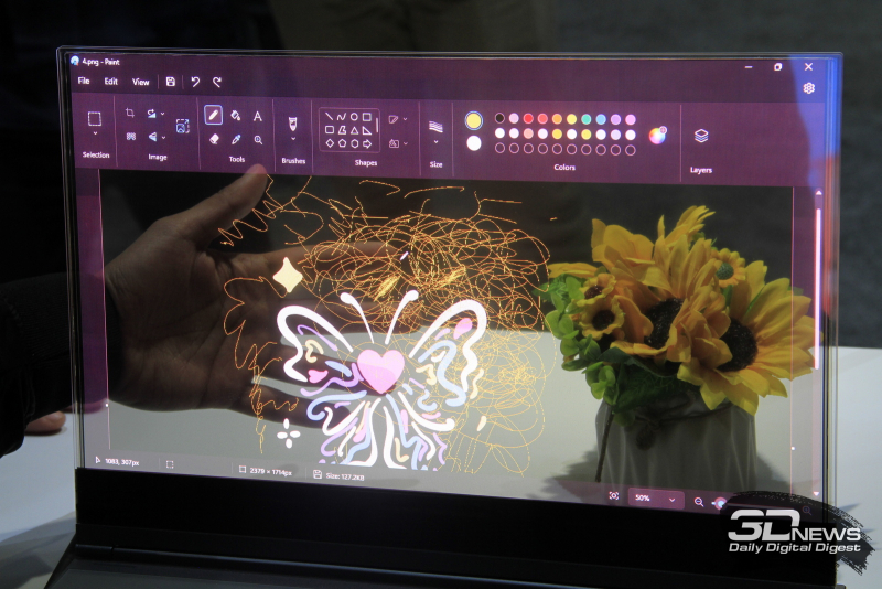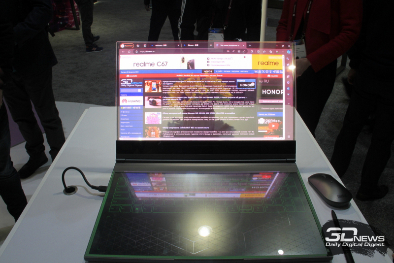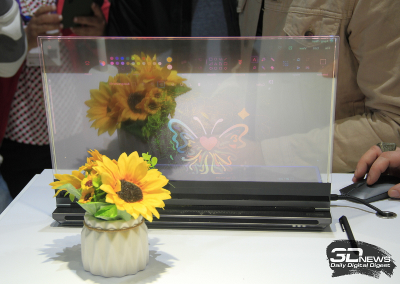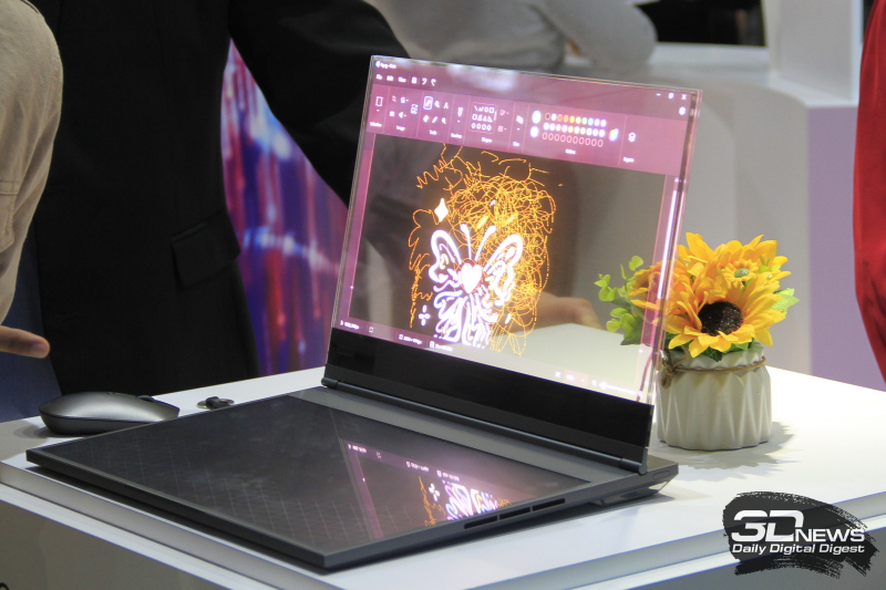 A principal característica do laptop é sua tela MicroLED de ponta a ponta de 17,3 polegadas, que oferece até 55% de transparência ao exibir preto (pixels desligados). E à medida que os pixels acendem e ganham cor, a tela fica cada vez menos transparente, terminando com uma superfície branca completamente opaca. O brilho máximo da tela é de 1000 cd/m2, tornando a imagem bastante saturada e o texto na tela fácil de ler. Há, porém, uma desvantagem: a resolução é de apenas 1280×720 pixels.