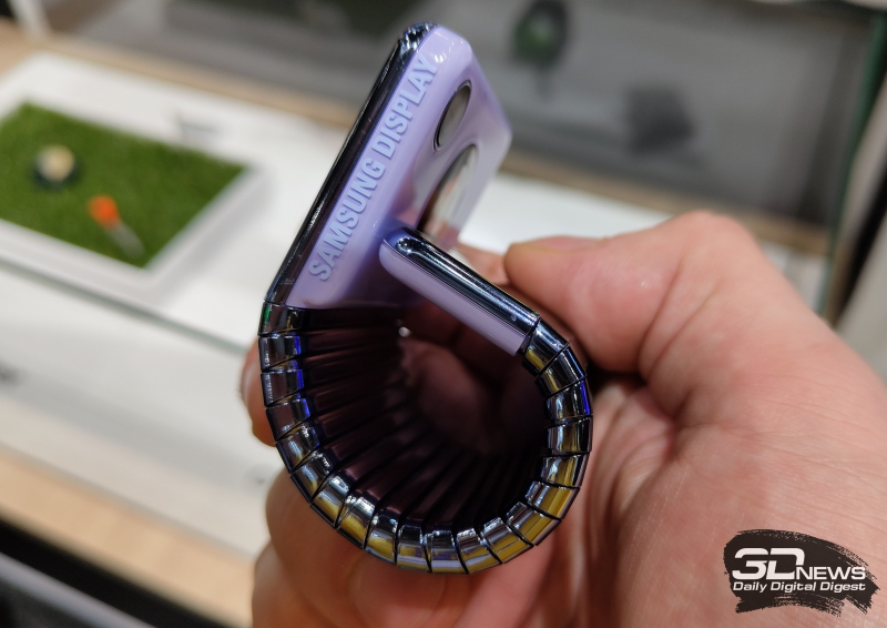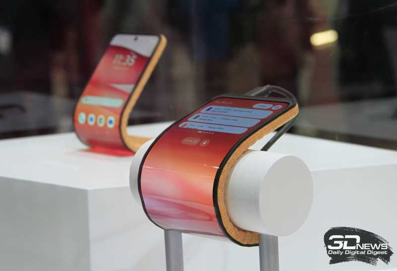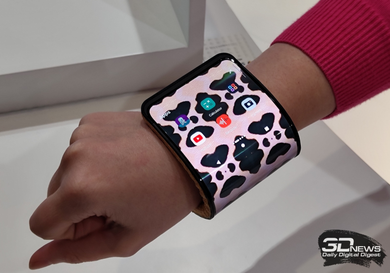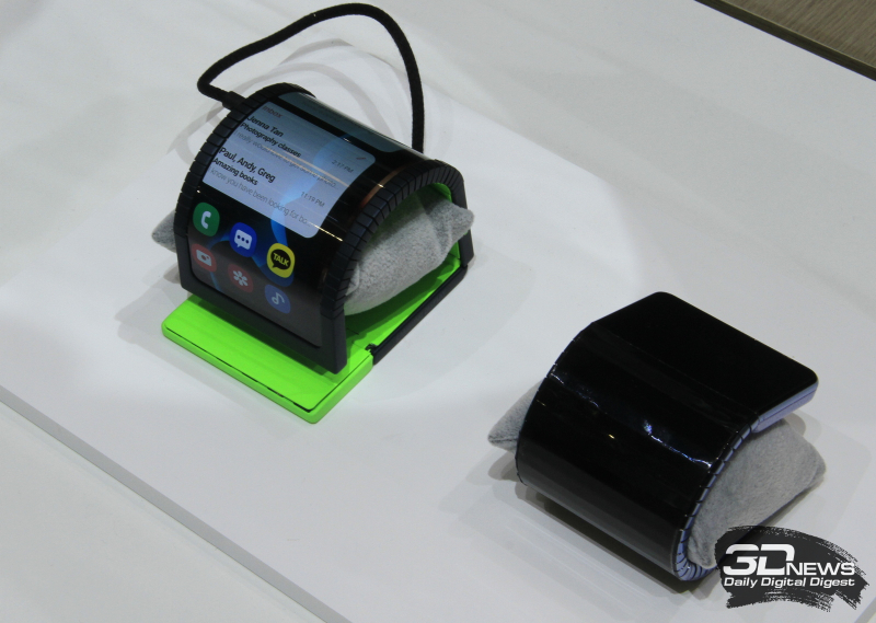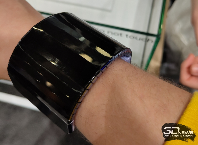 Ao lado do laptop transparente no estande da Lenovo está um smartphone conceitual flexível da Motorola que se propõe a ser usado na mão – ele envolve o pulso. Os gadgets com telas dobráveis ​​já existem há muito tempo e se tornaram comuns, mas dispositivos verdadeiramente flexíveis parecem o próximo passo na evolução.