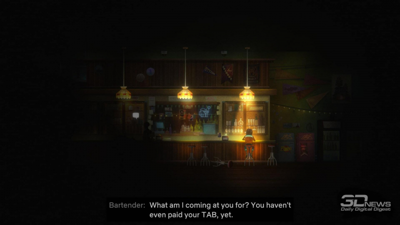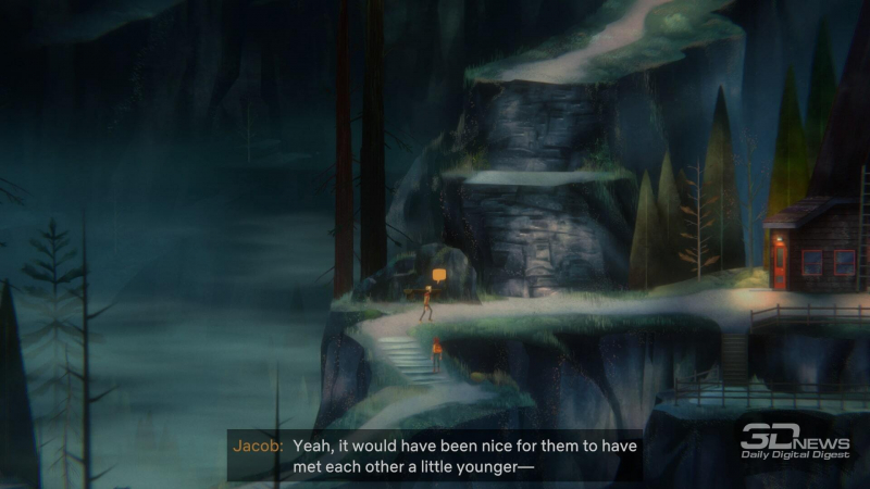 Por causa da tagarelice de Jacob, o diálogo como um todo parece um pouco artificial – às vezes parece que os autores naturalmente espremeram falas de si mesmos para preencher o “tempo de antena”. E é decepcionante porque a dublagem dos personagens é incrível. A sequência foi publicada pela Netflix, que há alguns anos adquiriu o Night School Studio, que está trabalhando na série Oxenfree. E a influência da empresa é sentida – os atores soam muito profissionais, e às vezes há até uma dissonância entre o estilo visual despretensioso (mas fofo) e a dublagem do nível de séries de grande orçamento.