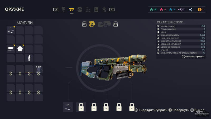 Obrigado por isso ao sistema modular de armas. Cada cano possui um certo número de slots para modificações, que não só redistribuem as características, mas também alteram o princípio de uso. Por exemplo, a partir de uma pistola você pode fazer uma submetralhadora de tiro rápido com cartuchos explosivos ou um revólver pesado e lento, que compensa a lentidão com um poder absolutamente monstruoso. É realmente interessante experimentar e embaralhar sua escalação de combate em busca da combinação mais eficaz, principalmente se você já conseguiu coletar diversas armas e uma dezena de módulos.