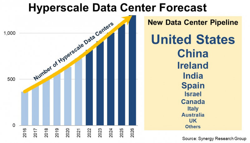 O Synergy Research Group publicou uma previsão de que, até o final de 2026, o número de data centers ultragrandes em operação em todo o mundo chegará a 1.200 unidades. Quase 40% dos data centers hyperscaler existentes estão localizados nos EUA, e a maior parte dos novos data centers será construída aqui. Ao mesmo tempo, China e Irlanda destacam-se como o segundo e terceiro países com maior número de projetos para a construção de data centers.