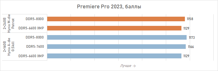 Além disso, não há diferenças significativas no desempenho de diferentes memórias no modo DDR5-8000, apesar do kit G.Skill Trident Z5 RGB DDR5-7600 2×16 GB permitir definir temporizações mais agressivas. Acontece que do ponto de vista das aplicações de trabalho, a memória do Patriot Viper Elite 5 RGB TUF Gaming Alliance DDR5-6600 2×24 GB quase não difere dos kits usuais de 32 GB nos chips SK hynix A-die.
