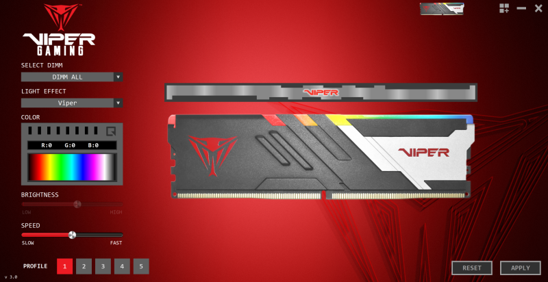 Além disso, a borda superior das lâminas é coberta por um difusor de plástico bastante grosso, necessário para suavizar o brilho que emana dos LEDs RGB. O controle de luz de fundo é padrão – os módulos Patriot Viper Elite 5 RGB TUF Gaming Alliance são normalmente reconhecidos pelos utilitários dos fabricantes de placas-mãe (Asus, ASRock, MSI e Gigabyte) e, além disso, o Patriot possui seu próprio utilitário de controle.