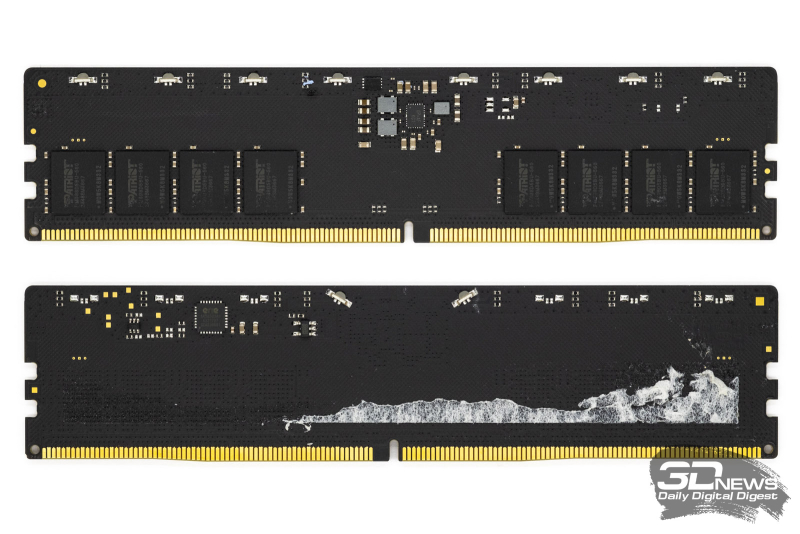 De acordo com as especificações, o kit Patriot Viper Elite 5 RGB TUF Gaming Alliance DDR5-6600 2×24 GB foi projetado para operar no modo DDR5-6600 com temporizações 34-40-40-84 a uma tensão de 1,4 V. Observe que o a linha do fabricante inclui também um kit de memória muito semelhante, mas consistindo em um par de módulos mais tradicionais de 16 GB, e seu esquema de temporização e classificação de tensão são exatamente os mesmos. Além disso, a semelhança entre módulos de diferentes capacidades pode ser vista no design do circuito, o que é fácil de ver se você remover o radiador deles.