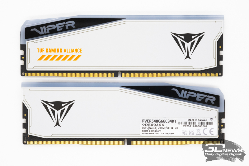 No entanto, tanto a primeira como a segunda hipóteses apresentadas requerem, sem dúvida, testes práticos, e é isso que faremos a seguir. E o kit de memória Patriot Viper Elite 5 RGB TUF Gaming Alliance DDR5-6600 2×24 GB (código de modelo PVER548G66C34KT), que a Patriot lançou em colaboração com a Asus sob a marca TUF Gaming Alliance, nos ajudará nisso. O facto de o produto pertencer a esta marca significa que não se trata de um premium, mas sim de uma solução de massa que deverá ter uma relação preço-desempenho favorável. E isso é verdade: o kit de memória de 48 GB em questão é mais barato do que muitos kits DDR5-7200 e DDR5-7600 de 32 GB, o que, desde que a memória Patriot tenha boa capacidade de overclock, pode torná-lo um candidato promissor para inclusão em PCs modernos.