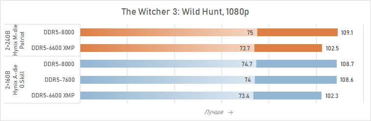 Olhando para os diagramas apresentados, mais uma conclusão importante pode ser tirada. Definir horários é um procedimento muito importante que não deve ser negligenciado em hipótese alguma. Mas ao usar módulos de memória em chips SK Hynix, esta recomendação assume um significado especial, uma vez que eles contêm um potencial significativo para melhorar o desempenho. Isso era verdade para kits de memória que consistem em módulos de 16 GB e permanece verdadeiro para kits maiores, como o Patriot Viper Elite 5 RGB TUF Gaming Alliance DDR5-6600 2×24 GB analisado. Por exemplo, o aumento no FPS quando é transferido do estado padrão para o modo rápido DDR5-8000 é em média de 9%. E é simplesmente irracional ignorar a oportunidade de obter tal aumento no desempenho dos jogos praticamente do nada.