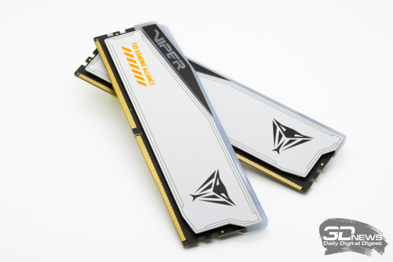 A altura montada dos módulos Patriot Viper Elite 5 RGB TUF Gaming Alliance é de 41 mm, 1 mm mais alta que a altura das tiras DDR5 típicas com dissipadores de calor e retroiluminação RGB. No entanto, essa memória ainda é compatível com a maioria dos supercoolers. Separadamente, deve-se notar que o contorno dos módulos em questão não é inteiramente retangular – um de seus cantos está truncado. Patriot ressalta que essa técnica de design deve fazer com que os módulos pareçam um trem de alta velocidade.