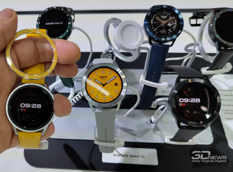 Mesmo no estande da Xiaomi, o smartwatch Watch S3 me chamou a atenção. Em termos de características, este é o smartwatch mais comum, mas há uma característica interessante em seu design que nunca foi vista antes em nenhum smartwatch de um grande fabricante. Esses são engastes (aros) substituíveis ao redor da tela. No Xiaomi Watch S3, você pode literalmente desparafusar a moldura física ao redor do mostrador do relógio e substituí-la por uma nova em questão de segundos. Este é um conceito bastante interessante e simples, mas por alguma razão ninguém o implementou antes. Ainda assim, os proprietários de relógios inteligentes mudam frequentemente de braceletes e mostradores, então porque não dar-lhes a oportunidade de mudar o design do próprio relógio? Por exemplo, instale uma faixa preta ou prateada para um evento formal e uma faixa laranja brilhante para uma festa. O relógio está avaliado em 150€.