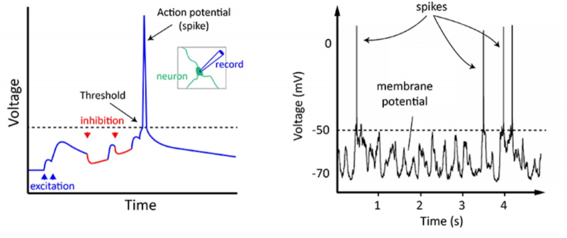 Esquerda: formação de um potencial de ação (um pico de voltagem que vai muito além do nível limiar) em um neurônio durante a soma ponderada de sinais excitatórios e inibitórios de dendritos. Direita: Pacote de picos individuais se propagando pelo axônio (fonte: The University of Queensland)