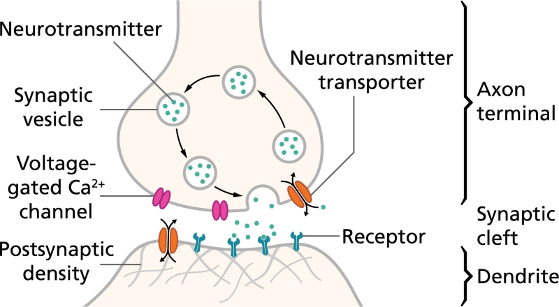 Na extremidade do axônio do soma, há uma sinapse – um contato especial por meio do qual o sinal de saída é transmitido ao dendrito de outro neurônio. Uma característica da estrutura do cérebro biológico é que a interação entre seus elementos não é puramente elétrica, como em um chip semicondutor, mas eletroquímica. A sinapse não é de forma alguma um condutor de sinal banal entre o axônio e o dendrito: sob a influência de um potencial de ação (um ou, em alguns casos, vários), libera certas moléculas, neurotransmissores, que se difundem em uma solução salina que preenche a estreita lacuna entre a sinapse do neurônio de origem e a membrana celular do dendrito do neurônio – receptor.