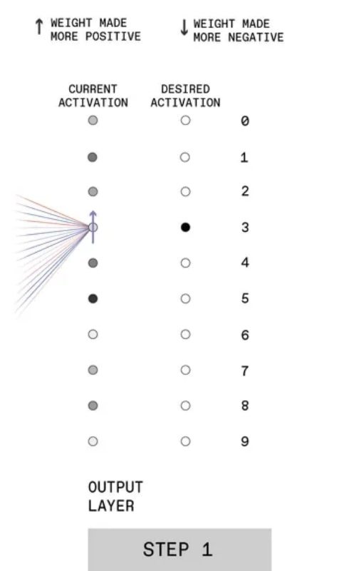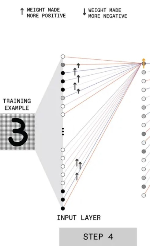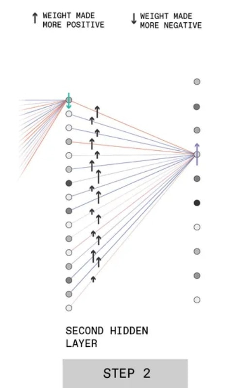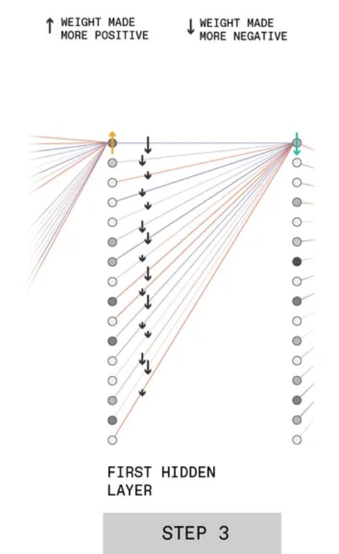 Na terceira etapa, mostra-se como se reduz a significância para a formação da resposta final daqueles perceptrons, cuja contribuição para a formação da solução “3” é negativa. Por exemplo, o perceptron superior na segunda camada oculta é obtido: digamos que sua influência precise ser reduzida (seta verde para baixo). Para isso, aplica-se o mesmo procedimento do passo anterior, porém com sinal contrário: quanto maior a contribuição do próximo perceptron da primeira camada oculta para a ativação deste neurônio artificial, mais forte (em módulo) será a ação corretiva vai ser.