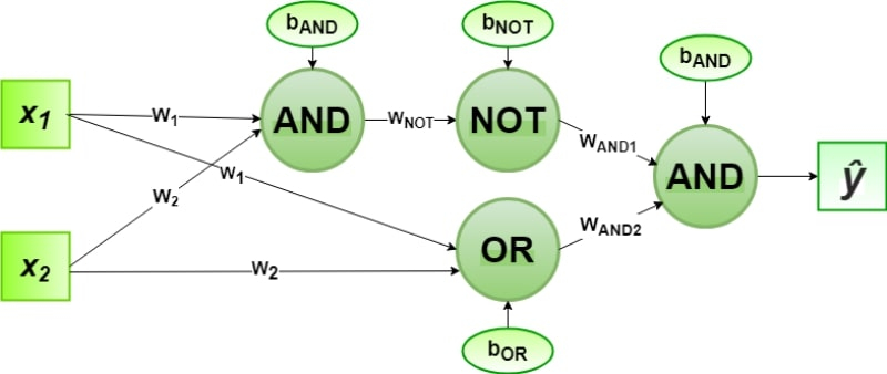 Uma rede perceptron multicamada já permite implementar a função lógica XOR combinando NAND (NOT e AND) com OR através de AND com os seguintes valores de peso: w1=1, w2=1, wNOT=–1, wAND1=1, wAND2 =1 — e constantes de normalização: bAND=-1.5, bOR=-0.5 e bNOT=0.5 (fonte: GeeksForGeeks)