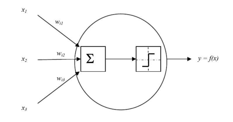 Modelo de neurônio artificial de McCulloch-Pitts: os sinais de entrada x1..x3 são modulados por pesos embutidos em código wi1..wi3, após o qual a soma (Σ) é executada. O valor resultante é comparado com o limite definido e, se for excedido, o sinal resultante y=f(x) é emitido (fonte: Research Gate)