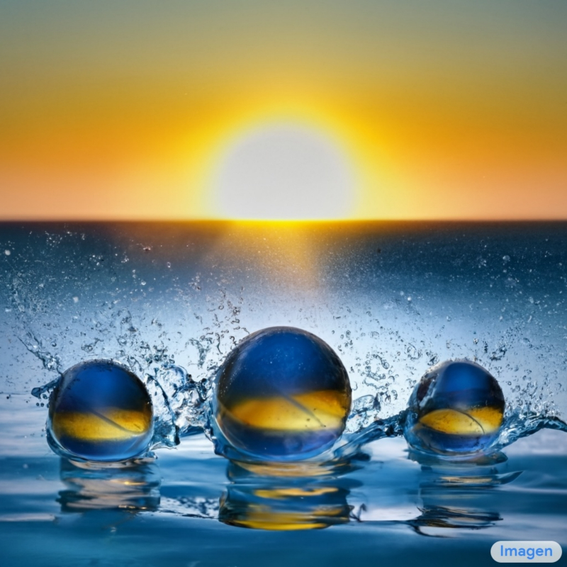 Uma imagem gerada pela rede neural Imagen usando a frase “Três esferas feitas de vidro caindo no oceano” como entrada. A água está espirrando. O sol está se pondo” (Fonte: Google)