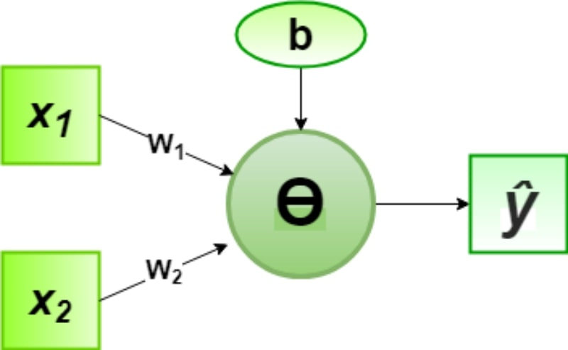 Um único perceptron com um limite de ativação Ө (se a soma ponderada dos argumentos ≥0, a saída é 1, caso contrário, 0) permite implementar funções lógicas básicas: quais – AND, OR, NOT e assim por diante – determinam os valores da constante b e dos pesos w1 e w2 (fonte: GeeksForGeeks)