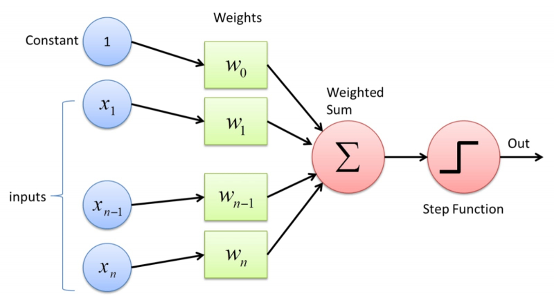 As entradas do Perceptron são alimentadas com constantes, sinais de sensores externos ou outros perceptrons e valores de peso, após os quais a soma ponderada e a ativação do potencial de saída de acordo com uma determinada lei são realizadas (fonte: Towards Data Science)