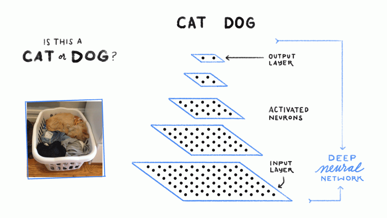 Um princípio ilustrativo de operação de uma rede multicamadas de perceptrons que identifica um objeto por um sinal separável (implicando uma clara dicotomia, a resposta é “sim – não”): um gato ou um cachorro? (fonte: Techaroha)