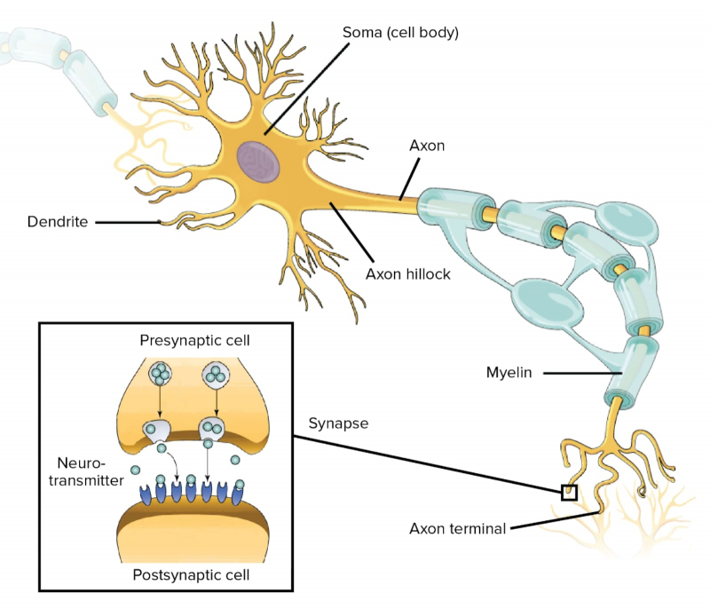 Os principais componentes de um neurônio e (inserção) um diagrama da organização da transmissão do sinal na fenda sináptica: acima – o terminal axônico, abaixo – o final do dendrito (fonte: Khan Academy)