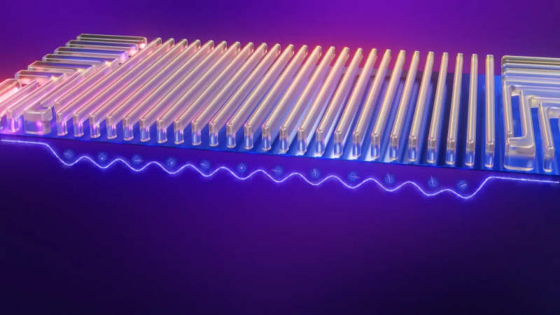 Imagem artística de doze elétrons sentados em poços de potencial sob a superfície da base semicondutora do chip Tunnel Falls – na verdade, os pontos quânticos deste sistema de computação. Linhas de luz finas multidirecionais em círculos de elétrons simbolizam os estados instantâneos de seus spins (fonte: Intel)